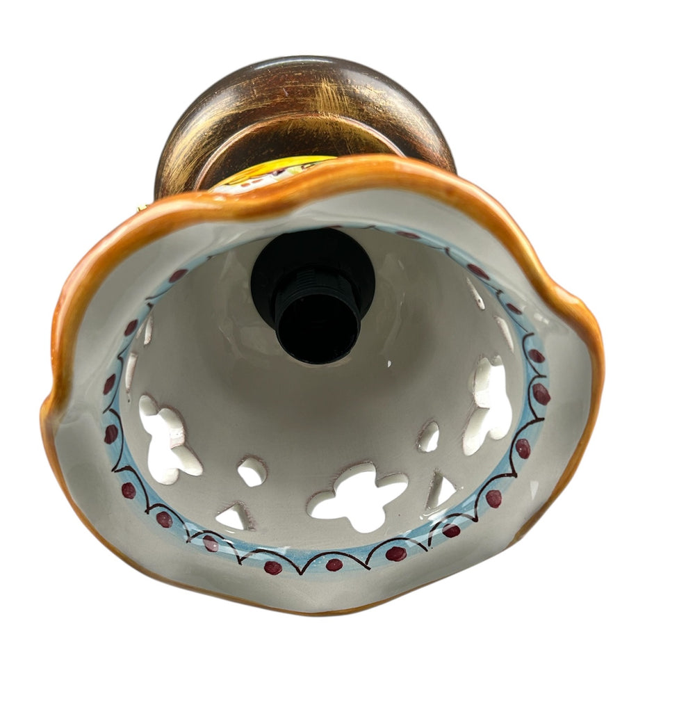 Illumina il tuo spazio con questa elegante plafoniera spot da soffitto artigianale Siciliana. La struttura in ferro battuto con finitura color ruggine (bronzo) si abbina perfettamente al diffusore in ceramica decorata, realizzato e firmato a mano da esperti maestri ceramisti siciliani. Con dimensioni di 15 cm in larghezza e una profondità dal soffitto di 15 cm, questa lampada si adatta perfettamente a diversi ambienti della casa. È dotata di un attacco E14 che può ospitare una lampadina fino a 40w (non inclusa) ed è compatibile con lampadine LED per una maggiore versatilità di illuminazione. Ogni pezzo è realizzato artigianalmente in Sicilia, garantendo un'attenzione ai dettagli e una qualità superiore. La combinazione di ferro battuto e ceramica crea un'armonia di materiali che aggiunge un tocco di eleganza rustica al tuo arredo.