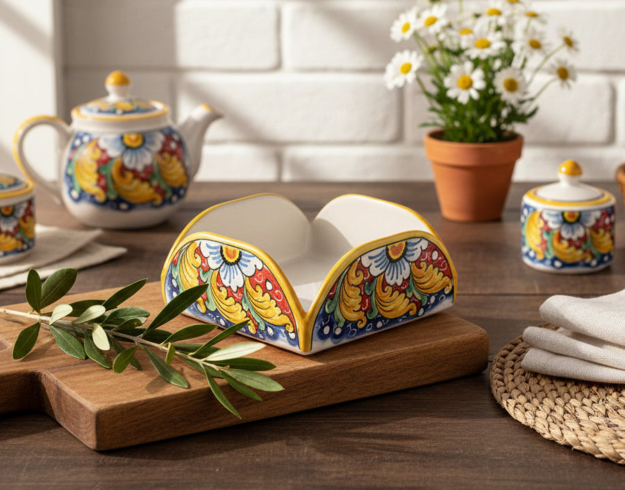 Square napkin holder made entirely of Sicilian ceramic and hand-decorated by the masters of Santo Stefano di Camastra, the heart of Sicilian ceramic art, measurements: width: 19cm, height: 8cm, these are products made entirely by hand, any imperfections denote the craftsmanship of the product! Item available for immediate delivery!