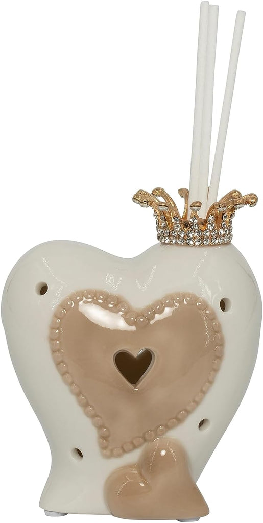 Bomboniera matrimonio profumatore con bastoncini e led cuore in porcellana bianco e tortora harmony PRMT23023