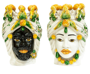 Coppia teste di moro in ceramica siciliana di Caltagirone h30cm art. giallo siciliano