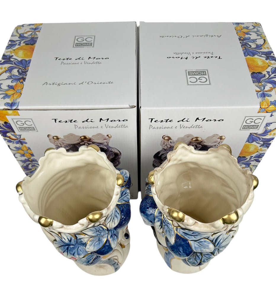 Coppia teste di moro regina e re in ceramica decorata stile siciliano vasi moderni gic foglie