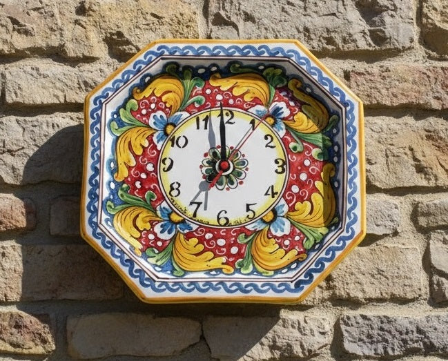 Orologio da parete in ceramica decorata a mano da ceramisti siciliani fiore rosso art 24