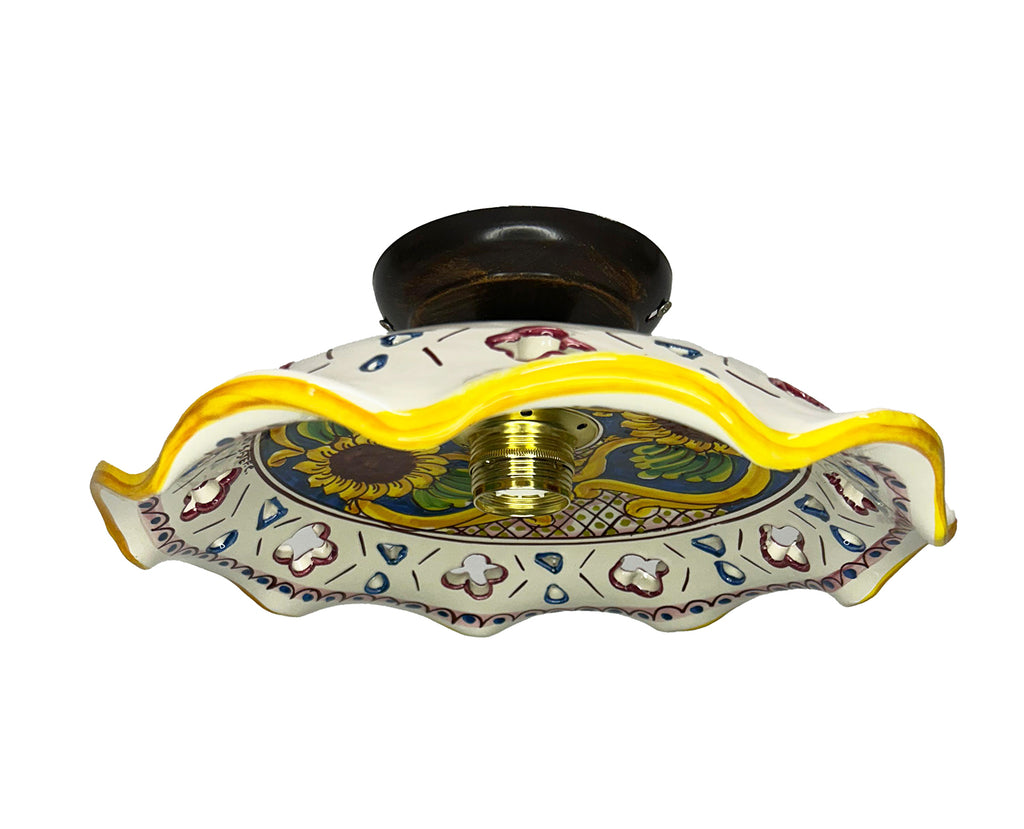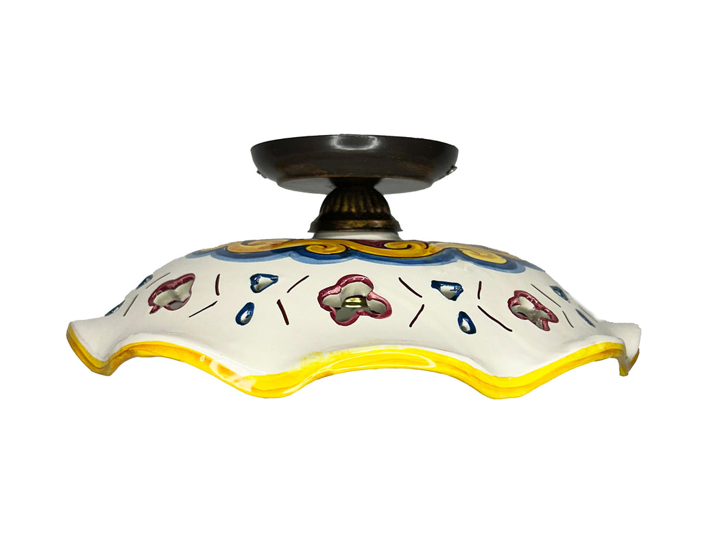 Illumina il tuo spazio con questa elegante plafoniera spot da soffitto artigianale Siciliana. La struttura in ferro battuto con finitura color ruggine (bronzo) si abbina perfettamente al diffusore in ceramica decorata, realizzato e firmato a mano da esperti maestri ceramisti siciliani. Con dimensioni di 30 cm in larghezza e una profondità dal soffitto di 13 cm, questa lampada si adatta perfettamente a diversi ambienti della casa. È dotata di un attacco E27 che può ospitare una lampadina fino a 60w (non inclusa) ed è compatibile con lampadine LED per una maggiore versatilità di illuminazione. Ogni pezzo è realizzato artigianalmente in Sicilia, garantendo un'attenzione ai dettagli e una qualità superiore. La combinazione di ferro battuto e ceramica crea un'armonia di materiali che aggiunge un tocco di eleganza rustica al tuo arredo.